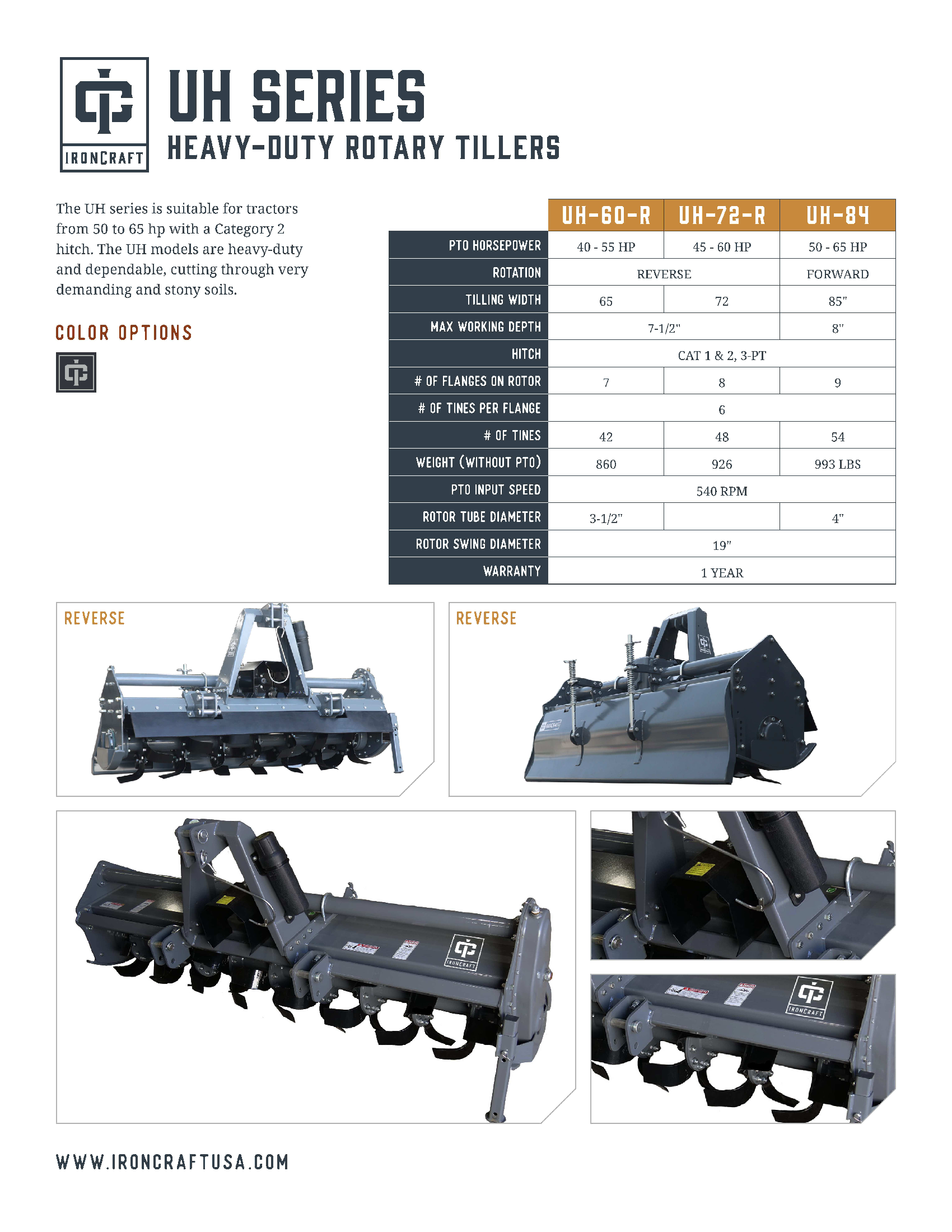 The UH series is suitable for tractors from 50 to 65 hp with a Category 2 hitch. The UH models are heavy-duty and dependable, cutting through very demanding and stony soils.